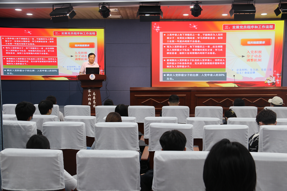 张国利首先解读了发展党员的原则、流程及注意事项,并结合新时代合格党员的标准对与会同学进行了教育和引导。张国利对员工党员提出了三点要求:一是提高思想认识,提高政治站位。要积极学习贯彻习近平新时代中国特色社会主义思想,切实增强“四个意识”,坚定“四个自信”,坚决做到“两个维护”,不断提高政治站位、不断坚定理想信念。二是坚定政治立场,保持良好作风。广老员工党员要不断提高政治判断力,要时刻保持政治方向和政治原则与党中央高度一致,要坚定不移地执行党的方针路线。三是提升自身修养,加强自身建设。要掌握过硬的专业知识,切实提高自身本领,在理论学习、科研领域、社会实践等方面充分发挥先锋模范带头作用。