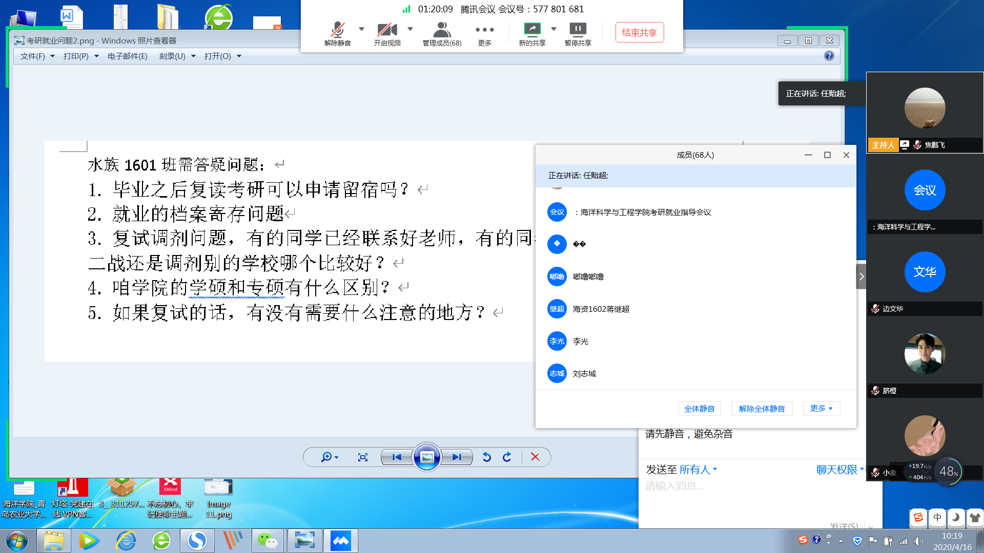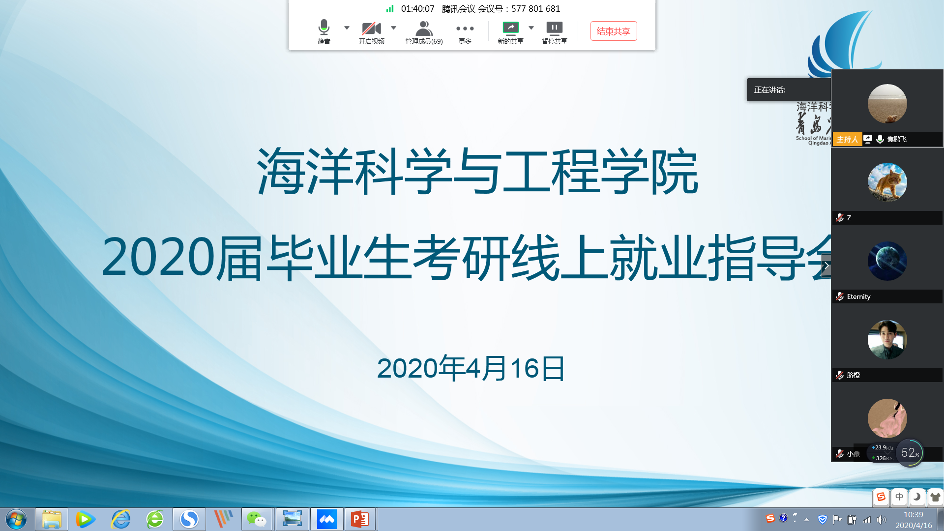 由于疫情缘故,本次会议创新性地利用了腾讯会议软件进行了云会议,各老师针对历年来考研、就业中存在的问题对毕业生就行了交流指导。会议伊始,任贻超就同学们的毕业准备及考研问题进行详细说明,重点阐述了考研复试的注意事项。此外,任贻超线上征集了应届毕业生就考研、就业方面存在的问题,并就二次考研生住宿、调剂、毕业论文的周志、导师、评优及毕业答辩等问题进行了在线答疑。焦鹏飞针对毕业生的就业中存在的竞争、岗位、实际效用等问题进行了解答,同时对二次考研及就业不自信同学进行了心理疏导。