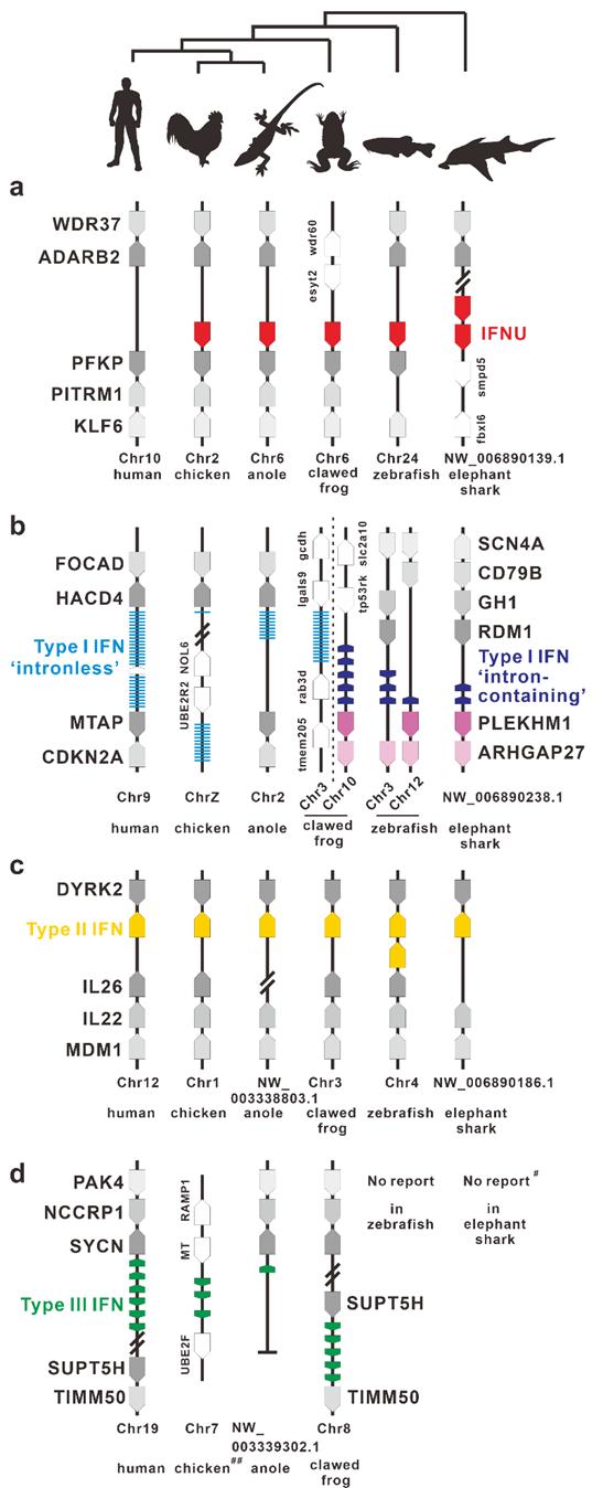 图1. 脊椎动物IV型(a)和I型(b)、II型(c)和III型(d)干扰素的基因共线性分析