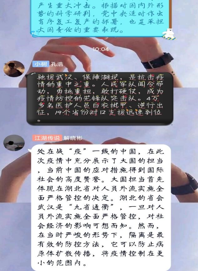 水生动物医学2019级1班实践团开展了以“疫情防控”为主题的社会实践活动。此次疫情,人们对每天新增病例、确诊人数以及疑似病例的相关数据也为之震撼,这其中不免也有些人为了赚取流量从而伪造数据、传谣信谣,博取人们的眼球,造成了社会恐慌。为此同学们对传谣信谣发表了自己的意见与看法,并且呼吁大家不信谣不传谣,做一个知法懂法的合格老员工。同学们于线上了解到人们对疫情的认知与看法,并且宣传了疫情防控的相关知识。同时也宣传了抗疫先锋的故事,提高人们对抗疫先锋、白衣天使的敬畏之情。同学们纷纷表示,作为新时代的老员工,在学好知识的同时,也要心系祖国、心系人民。为抗击疫情、防止疫情再度发生作出自己的贡献。