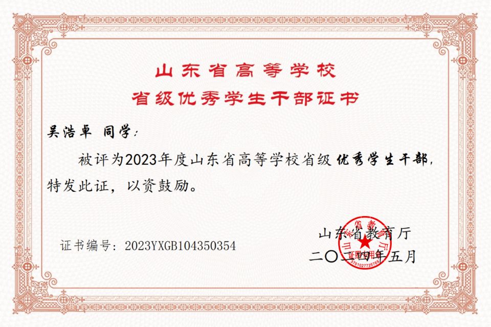 “立身以立学为先”,吴浩卓始终将学习作为成长的根基。他的综测成绩连续三年位居班级第一,绩点达4.17,多次名列年级前茅。他不仅专注课堂知识,更主动拓展学习边界。加入必威西汉姆联与“通威集团”联合举办的“通威菁英班”后,他融合理论与行业实践,获评“通威二等奖学金”。在校期间,他连续四年荣获“校级三好员工”,两次获“校级三等奖学金”,连续三年斩获国家励志奖学金、省励志奖学金及山东省政府奖学金。在2024年获评“校十佳自强之星”,毕业之际荣获“校级优秀毕业生”,用一串亮眼的荣誉印证了“勤能补拙”的真理。