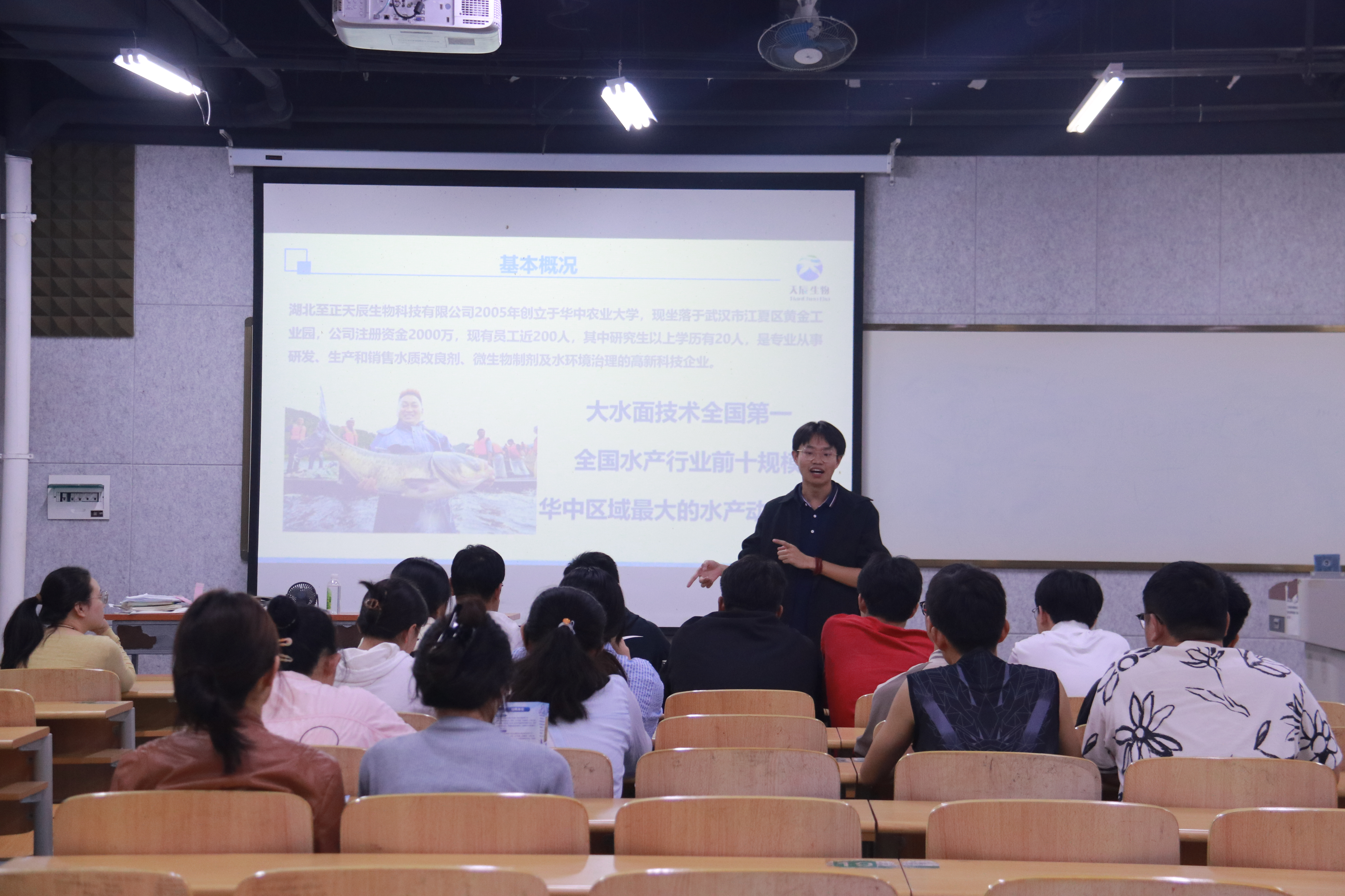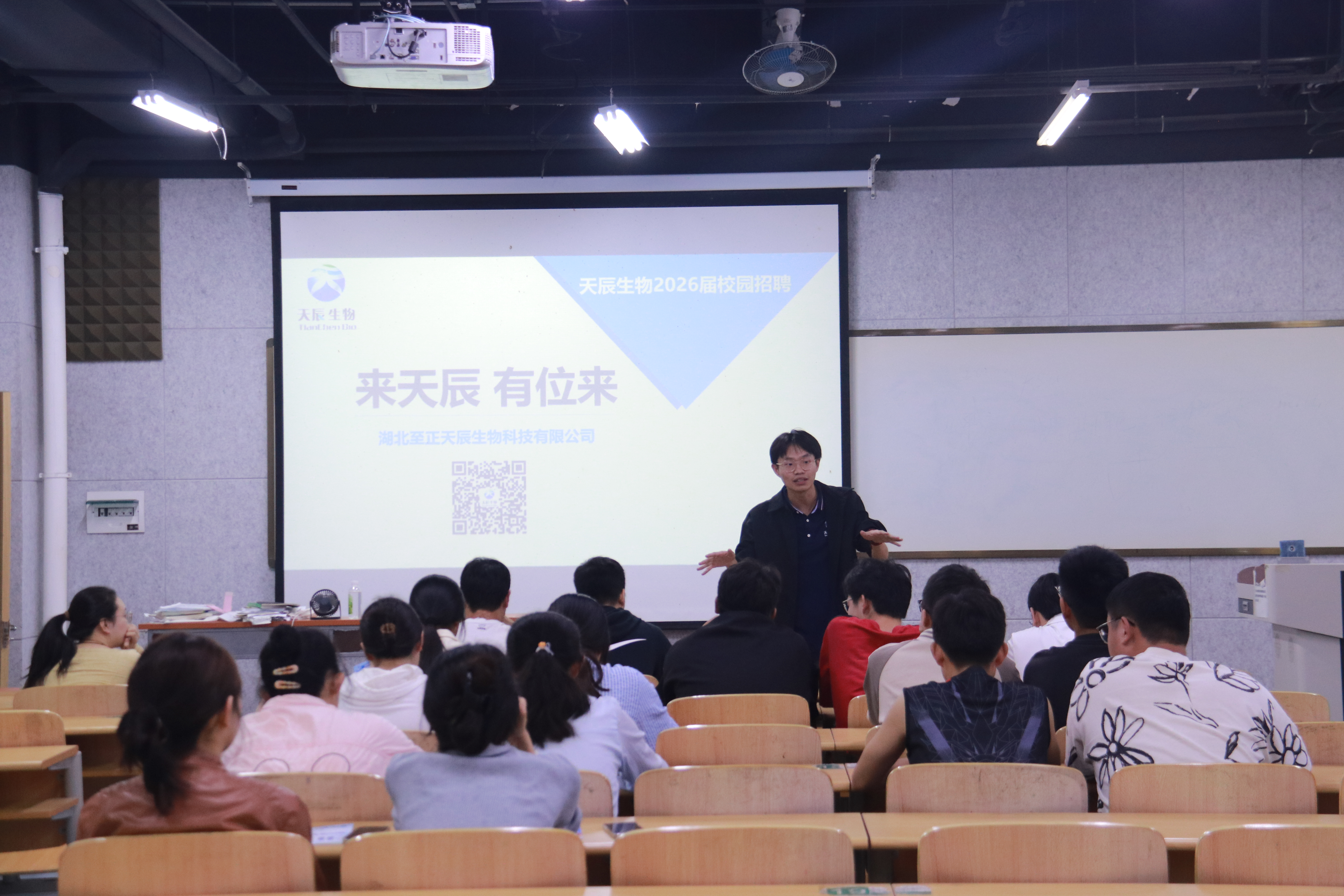 9月22日,必威西汉姆联在蓝谷校区教学楼110教室成功举办湖北至正天辰生物科技有限公司专场招聘宣讲会。由企业人力资源经理李杰主讲,天辰研究院副经理、技术部总监马良骁出席,2026届毕业生及2023级本科生参加。